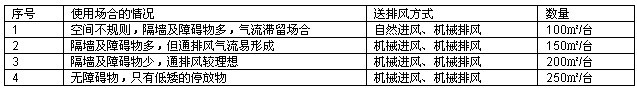所需誘導(dǎo)風(fēng)機(jī)的臺數(shù),在考慮通風(fēng)方式(機(jī)械送排風(fēng)、自然送排風(fēng)、自然進(jìn)風(fēng)機(jī)械排風(fēng)),有無隔墻,空間形狀的前提下,按每臺誘導(dǎo)風(fēng)機(jī)所需要承擔(dān)的面積計(jì)算,可參考下表:
